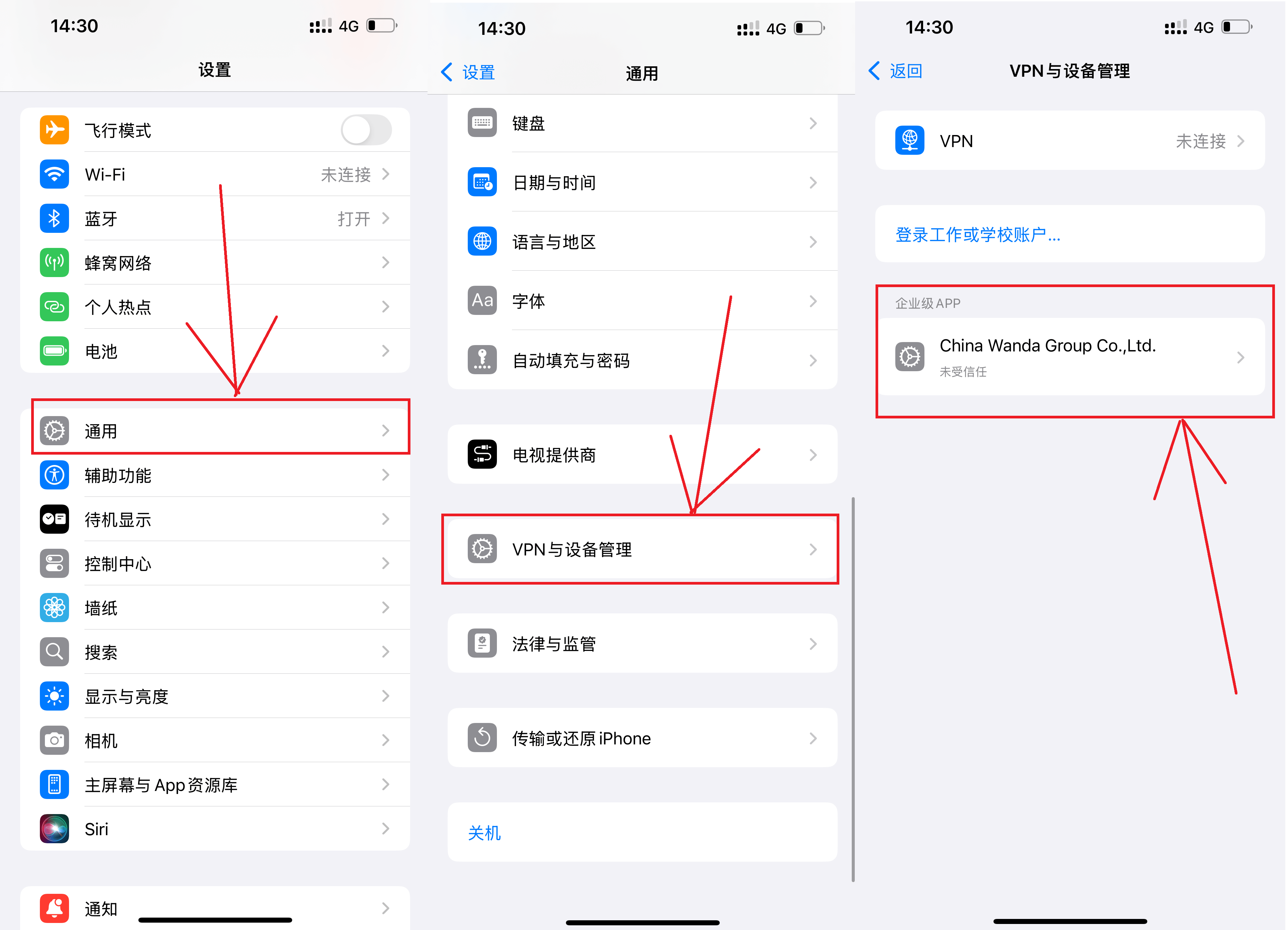2、 点击 「设置」找到「通用」找到「VPN和设备管理」